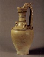 说 明: 胎质疏松,胎骨较轻,胎色灰白.造型修长.釉色青中闪黄.为隋代鸡首壶之典型.