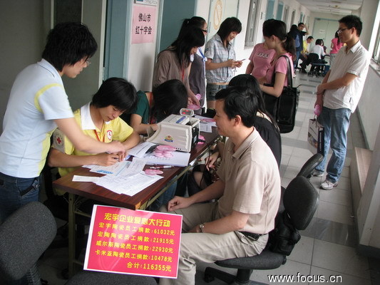 截止到18日,宏宇陶瓷企业以单位名义捐款100万元,宏宇企业禅城区全体员工捐款合计11.6355万元,另外南海狮山和清远市的两个生产基地的募捐分别为10.73703万元和11.39242万元。宏宇企业捐款合计133.82165万元。