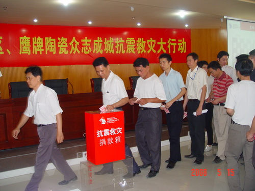 5月15日上午,鹰牌控股公司举行情系灾区,鹰牌陶瓷众志成城抗震救灾募捐大行动,倡议:出一份力,献一份心!公司全体员工携手灾区人民,共抗震灾!