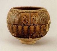 说 明: 胎质灰黄,坯上一层白色化状土.施褐釉,光润透明.整体装饰纹样似一朵莲花,雅丽华美.为隋代湘阴窑难得的精品.