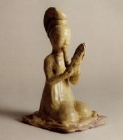 说 明: 俑白胎,通体黄釉,并施彩绘,年久已脱落.此俑是黄釉乐舞俑群中的一员.