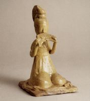 说 明: 此俑是黄釉乐舞俑群中的一员.俑白胎,通体施黄釉,并施彩绘,年久已脱落.