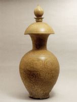 说 明: 釉色青黄,釉面润泽晶莹,通体绘釉上褐彩如意云纹.器型庄重雄伟,极其气魄.为越窑精品,也是当时贡品.