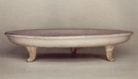 说 明: 胎骨坚硬,釉色闪灰色,釉润泽均匀,布满细碎小开片,具有唐代中期三足盘的典型特征.