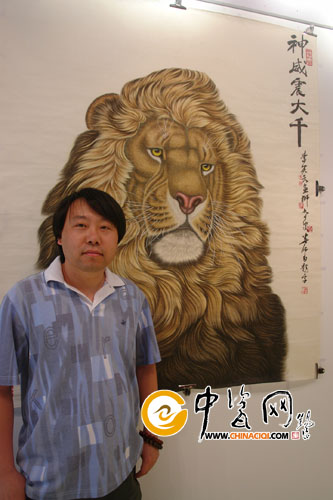 此次在珠山陶瓷艺术馆举办的展览,是李笑天第一次在景德镇举办的个人作品展,展览作品包括国画、绢画、陶瓷。其中长绢《百虎图》尤其吸引人,一百只老虎形态各异,或嬉戏,或静卧,调皮可爱的形象跃然纸上。工笔《神威震大千》中狮子形象逼真,鼻子上的短毛历历可数,表现了作者深厚的功底。