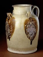 说 明: 器体较浑圆,周身施釉,釉色青绿有光,釉下是褐斑彩贴,素底,胎色灰白.
