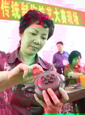 6月1日,陶瓷艺人创作紫砂茶壶《情系奥运》。