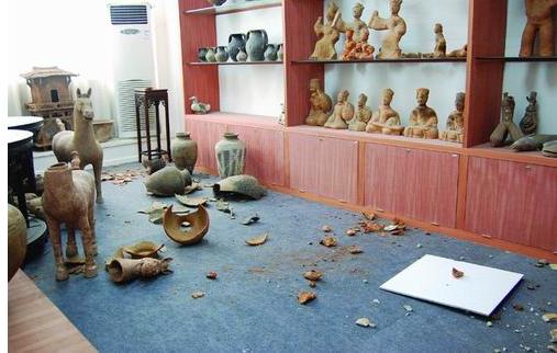 几年前,他在老家成都市新津县创建了一个西南岳氏会所,会所里主要陈列了瓷器和古陶器。“地震发生时,我坐在办公室里。只见房子剧烈摇晃起来,摆满各式古玩的博古架也跟着抖,一瞬间,所有的东西都哇啦啦地往下掉。”岳玉明冲过去,但已经无能为力。“看着砸,根本没办法,抓得住这个就抓不住那个。”隔了多日,岳玉明依然沮丧得要命,“几秒钟时间,全完了!”