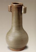 说 明: 直口,平唇,细长径,径上部装贯耳,鼓腹,矮圈足.施粉青色釉,圈足底无釉,呈朱红色.