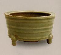 说 明: 外壁徒口沿至底边饰三组弦纹,炉裹外施青釉,间细碎纹片,内底中心与圈足边无釉,露火石红胎.