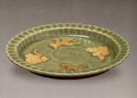 图片名称: 龙泉窑青釉贴花云鹤纹菊花口盘