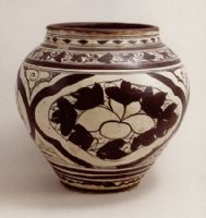 说 明: 底部露胎,胎体砖红色,胎质坚细。器外施满白色底釉,上绘黑褐色花卉图案。