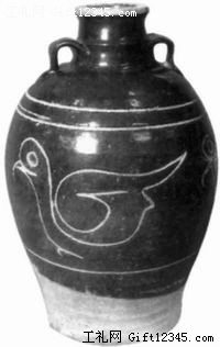 划刻三鸟纹双耳罐 瓷质,高27厘米,口径6厘米,底径17厘米。此瓶直口肩伏双系,圆肩腹下直,显得很重,半釉至腹下,刻三鸟,手法写意,简单概括,一笔划刻出鸟全身,再用一笔画圆布眼,只两三笔鸟儿便活灵活现。