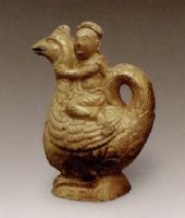 说 明: 胎白质细,釉白泛灰,釉厚处发黄绿,底有流釉现象。此壶型陶塑十分奇特,构思巧妙。