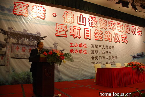 2008年6月20日上午,湖北襄樊投资说明会暨签约仪式在广东佛山召开。湖北省襄樊市人民政府、老河口市人民政府、南漳县人民政府主办的招商会以吸引佛山陶瓷企业为主。在招商会上,主办方向佛山陶瓷企业代表介绍了当地的资源和区位优势,并热情的邀请佛山陶瓷企业去当地创业。