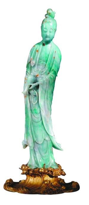 匡时推出的“清代宫廷艺术品专场”20件拍品中成交了19件,成交率高达95%,成交总额达7032.48万元,其中17件拍品的成交额都在百万以上,2件的成交价逾千万。最高价是一件清中期《翡翠观音》,此翡翠观音采用圆雕技法,整个造像简洁明快,面相清秀,体态文静,层次分明,刀法线条含蓄刚劲,雕工精湛,翠绿丰富,纹理全面,用料质佳,是上等翡翠中难得一件的雕品,经过藏家的激烈竞拍,最终以1814.4万元成交,高出最高估价2倍。