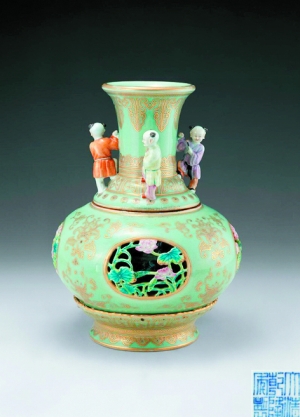 No.3清乾隆《粉青釉描金镂空开光粉彩荷莲童子转心瓶》