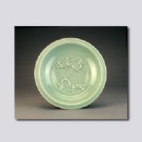 龙泉窑从宋代始烧,一直到清朝,南宋为龙泉窑烧制的高峰,采用薄胎厚釉的技术,多次上釉,烧出龙泉窑最好的釉色-粉青、翠青、梅子青。此盘心贴两条相向的翼龙 ,釉色青翠。