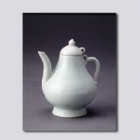 永乐白瓷以其胎薄釉莹之娇媚,给人一种"甜"的感受,故称之为"甜白"。此执壶釉面洁白莹润如堆脂,釉下饰以线条纤细的刻印暗花,轻盈秀丽。