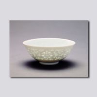 首都博物馆藏。敞口,弧腹,圈足。通体施青釉,腹壁镂雕蕃莲纹。底书青花“大清乾隆年制”6字3行篆书款。胎体轻薄,釉色清新明亮。在很薄的胎体上刻镂空花纹,然后施以透明釉将花纹填平,纹饰透明,对光透影,又称“玲珑”。