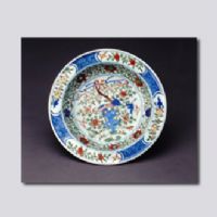首都博物馆藏。折沿,曲腹,砂底,隐圈足。折沿上绘青花锦地开光花鸟图案,底心彩绘雏鸡、牡丹。内壁饰缠枝花卉,外壁饰勾枝花和4块“卍”字锦地纹。外底书青花双圈“大明万历年制”6字双行楷书款。