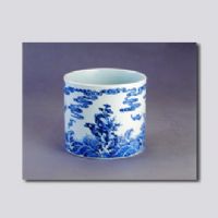 首都博物馆藏。直口,口底直径相若,平底,底部有玉壁形涩圈。外壁通景绘以寿石、蝙蝠、海浪、祥云,组成寿山福海的吉祥图案,寓意“福如东海,寿比南山”。釉面莹润,白中泛青,胎体坚硬,洁白细腻。青花绘画是追摹明朝永乐、宣德时期青花的特色,线条间用笔点染出苏泥勃青料的晕散效果与结晶斑点。画面布局舒朗,笔触纤细,十分典雅。