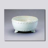 首都博物馆藏。敞口,浅腹,平底,底部承以兽面三足。内外施青白釉。内心及外底均无釉,口沿及近底处各环饰一周整齐的乳钉纹,外壁刻串枝莲花。器表釉色光润,造型别致。