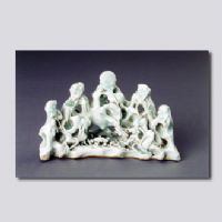 首都博物馆藏。笔架镂雕成五座山峰形,浮云环绕。主峰粘贴有云、月纹,恰似彩云托月。山崖一侧有藤蔓和青竹。山脚下海水汹涌,浪花飞溅,游龙逆水嬉戏。胎质坚硬,釉面光滑细腻,造型别致。