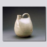 首都博物馆藏。扁圆形。筒状小口,另一侧有提梁,垂腹,平底。通体施白釉,施釉不及底,釉面有细碎开片。口沿下有一圈戳印纹,腹部两侧及下腹部饰一周仿皮条状凸棱。釉面莹洁,造型浑厚。