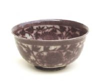 器型古朴浑厚留有元代遗风,器内外口沿绘回纹,内壁绘折枝菊花,外壁绘折枝牡丹,器身通体开片。器物的花朵,花叶,釉色与洪武时期的景德镇御窑厂出土的残型器完全相同,其制作年代应定为洪武时期。釉里红创烧于元代,以氧化铜为着色剂,在1200℃左右的还原气氛中一次烧成。由于铜在窑室中气氛要求严格,所以烧成难度大,产量低,像这样一件明代早期的釉里红大碗,保存完整,釉色纯正,现存世屈指可数,极其珍贵。