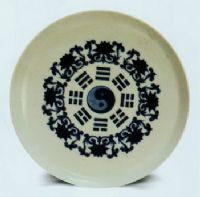 盘内心绘太极八卦图,四周环绕折枝莲花,太极图形展现了一种互相转化相对统一的形式美。底书,大清雍正年制”六字楷书款。造型规整,纹饰秀丽,堪称官窑瓷中之精品。