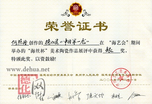 日前,在首届中国“海丝”工艺品博览会上,德化县燕丹瓷研所创作的立体书法瓷雕《中国第一龙》荣获此次博览会银奖。