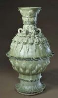 尊撇口,长颈,鼓腹,高足外撇,肩、颈有6个条形系。通体纹饰达11层:颈部饰纹3层,自上而下为飞天、宝相花兽面及蟠龙,以凸弦纹间隔;腹部为器物装饰的主要部分,由6层莲瓣组合而成,上覆下仰,瓣尖向外卷起;胫部亦饰覆莲瓣两层,瓣尖亦外卷。器物通体施青绿釉,圈足内深厚,素胎无釉。