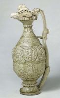 壶盖与壶口吻合成凤头状,使得壶整体颇似一只挺立的凤鸟。壶柄塑成一直立的蟠龙,龙口衔住口沿,作窥视探饮状,前肢撑于壶肩部,后肢立于喇叭形底座上。壶体以塑贴和刻划技法装饰。腹部塑贴主体纹饰两层,上为6个联珠纹圆形开光,内有手舞足蹈的力士,下为宝相花6朵。口沿、颈、肩及胫部饰以联珠纹、莲瓣、卷叶或垂叶纹。各组纹饰间以弦纹相隔。此壶胎体厚重,釉层凝厚,玻璃质感强,带有北朝以来北方青瓷的遗风。其装饰纹样繁复,结构严谨,层次清晰。