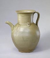 执壶撇口,直颈,四瓣瓜棱形椭圆腹,一侧置弯曲的长流,另一侧置曲柄,流与柄之间有双条形系,圈足。外底刻有“太平戊寅”四字。通体施青绿色釉。“太平戊寅”即北宋太平兴国三年(978年)。