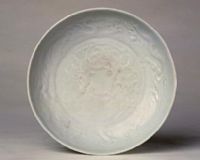 盘直口,浅弧壁,圈足。胎体坚致洁白,里外施白釉。盘心及内壁模印云龙纹。