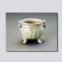 首都博物馆藏。折沿,束颈,瓜棱腹,平底,三兽足。肩两侧贴对称带状双系,内口沿及器外施卵白釉,三足满釉,底部支烧,故外底有窑渣和支烧痕迹。釉层较厚,釉色白中微泛青。该器出土于元代墓葬,墓主张弘刚是元朝初年重臣,葬于元大德九年(1305年),因而此炉为有明确纪年的元代卵白釉器。