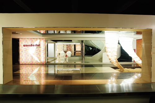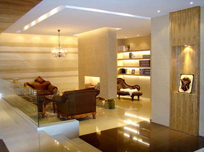 一层大厅取名为“蝶应”,用两股缠绵的“龙卷风”与漫天飞舞的蝴蝶诠释“蝴蝶效应”。一楼主要展示负离子砖和抛光砖,产品空间设计出于时装专卖展示之手法,导入抛光砖镂空雕刻之艺术,以气派之势突出抛光砖干挂,区域分布合理得体与大气的大堂融为一体。