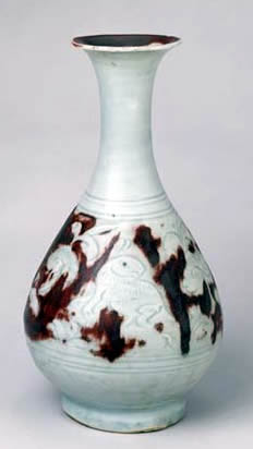 瓶撇口,细颈,圆腹,圈足。俗称“玉壶春瓶”。通体施青白釉,肩部及腹径最大处各有暗刻弦纹四道,上腹部暗刻一只野兔奔跑于花草间,刻花技法娴熟,刀锋犀利洒脱,线条流畅自然。小兔作回首观望状,以釉里红点睛,形象栩栩如生。花纹空白处随意涂抹釉里红,形成红地白花,增强了图案的艺术效果。瓶内口部施釉里红。