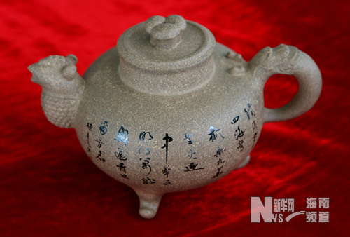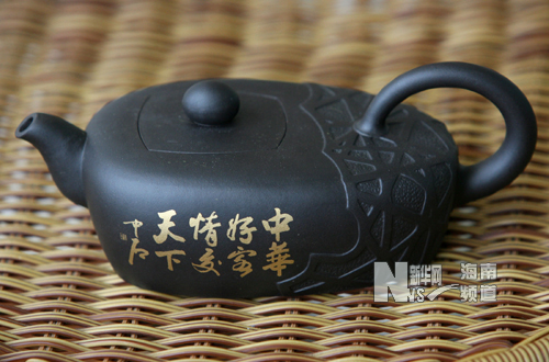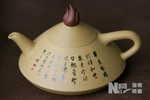 这是一把带有“火炬”和书法作品的紫砂壶(7月12日摄)。新华社记者 李明放 摄