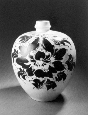 第二部分:黑白交织的磁州窑。黑与白的色彩对比和丰富多彩的装饰手法,造型和装饰无不洋溢着浓郁的民间风情和乡土气息。展品共18件,件件都是磁州窑精品,其中刘立中的芦雁纹扁壶、白地黑花牡丹纹大圆瓶更是匠心独具。