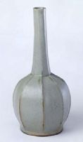 瓶直口,长颈,腹部呈八棱形,圈足外侈。灰白色胎,质致密。釉呈浅青绿色,唐人陆龟蒙诗云:“九秋风露越窑开,夺得千峰翠色来”,道出了越窑青瓷的釉色特点。