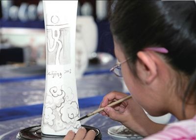 昨天上午,一名学生在陶瓷上描绘心中的奥运梦想。当天,中国儿童中心彩色盒子美术工作室的30多名学生来到位于房山区良乡的商周景德镇瓷艺馆,参加“迎奥运,承国粹”青花瓷笔会。