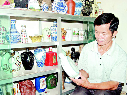 刚开始,冯新桂都是到酒店里向人家收购,后来觉得单与酒店联系收不到比较特别的酒瓶子,于是开始跟一些酒厂联系。“几乎每周都会跟他们联系一两次,他们如果推出新样式的酒瓶,就会通知我注意收藏。”冯新桂说,只要觉得很特别的酒瓶,他都会收购回来,特别是一些仿青花瓷制作的酒瓶子。