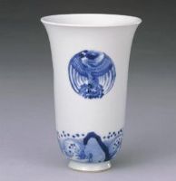 杯敞口,体瘦长,圈足。杯身绘三组团凤纹,近底处绘礁石海水纹。足底青花双圈内书“大明成化年制” 三行六字楷书款。