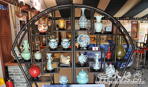 青花瓷道出口处的一片绘着红色金鱼,“踩一踩吉庆鱼,象征着幸福吉祥。”小屋的一角,建起一座瓷窑,展示景德镇的瓷器、瓷器残片、旧窑砖,还有传统的拉坯制瓷工艺,向世人展现中国悠久的陶瓷文化。一串白如玉、明如镜的青花瓷项链,更是让人心生向往。