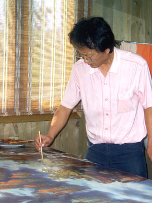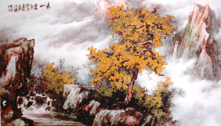 “中华陶艺村”顾名思义,是个不同寻常的瓷苑高地,荟萃了景德镇数十位重量级陶瓷艺术家。这个民间社团性的“村长”大概非任命而是公推的。身为景市美术家协会副主席的实力派陶艺家龚循明,原本对现在泛滥贬值的各种头衔不屑一顾,却顶起了这无级别却有份量的名头。在他的工作室里,龚循明刚好完成了一幅大瓷板风景画,让我眼睛一亮:构图独特、意蕴深远,自不必说;光是画面的造型语言和笔墨技法,就包含了东西方原本各异但被此画融合得浑然一体的多种绘画元素,使人有既熟悉又陌生的感觉,一种全新的审美感觉。龚先生说:“明代大画家石涛的‘笔墨当随时代’箴言,应是每个有追求的艺术家的创作准则。我不愿意从题材到技法都重复古人,真正的陶瓷艺术家应该师古而不泥古,借鉴而不崇洋,每个时代都要努力超越和创新。”他还说,10多年来,一直在努力探索陶瓷山水画的新路子。比如,这幅山水画中既有线条、皲法等传统笔墨,也有西方油画的色块技法……