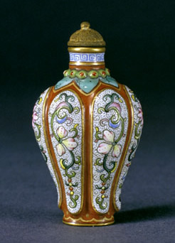烟壶呈瓜棱形,细颈,铜镀金錾花盖,下连铜镀金勺。颈部绘蓝彩回纹,颈、肩相接处饰串珠纹一周,下绘变形莲瓣纹。肩、腹部呈六瓣瓜棱状。瓜棱上轧粉彩折枝花卉,色彩淡雅,花纹精细。瓜棱间隙处为珊瑚红地,上下以金彩点缀,衬托出烟壶的富丽华贵。足内红彩篆书“乾隆年制”四字款。