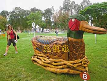 据香港文汇报报道,近200名中外传媒7日在总设计师艾荣顿和史密夫的带领下参观香港奥运马术上水双鱼河的越野场地。跨栏的设计首次曝光,包括龙、万里长城、花灯、鸳鸯、木鱼和街市的藤箩都成为创作跨栏的元素。