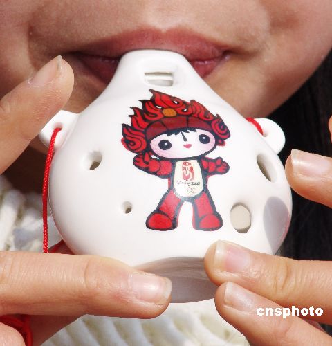 在江西省景德镇营业员吹奏“唱响福娃埙”。